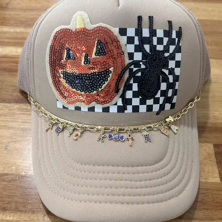 This over the top Halloween trucker hat is JUST what you need this spooky season! Sequin pumpkin, sequin spider, checkered background, and the trick or treat trucker chain to top it off! Available on khaki foam, white/black foam, and white/orange foam trucker hats. Foam truckers have a foam front, mesh back, and adjustable snapback enclosure.